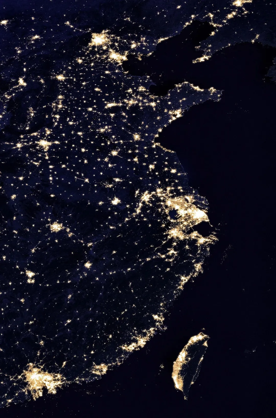 我國東部夜間衞星圖,中間大面積連續的明亮區域為長三角地區 | 圖片來源@NASA
