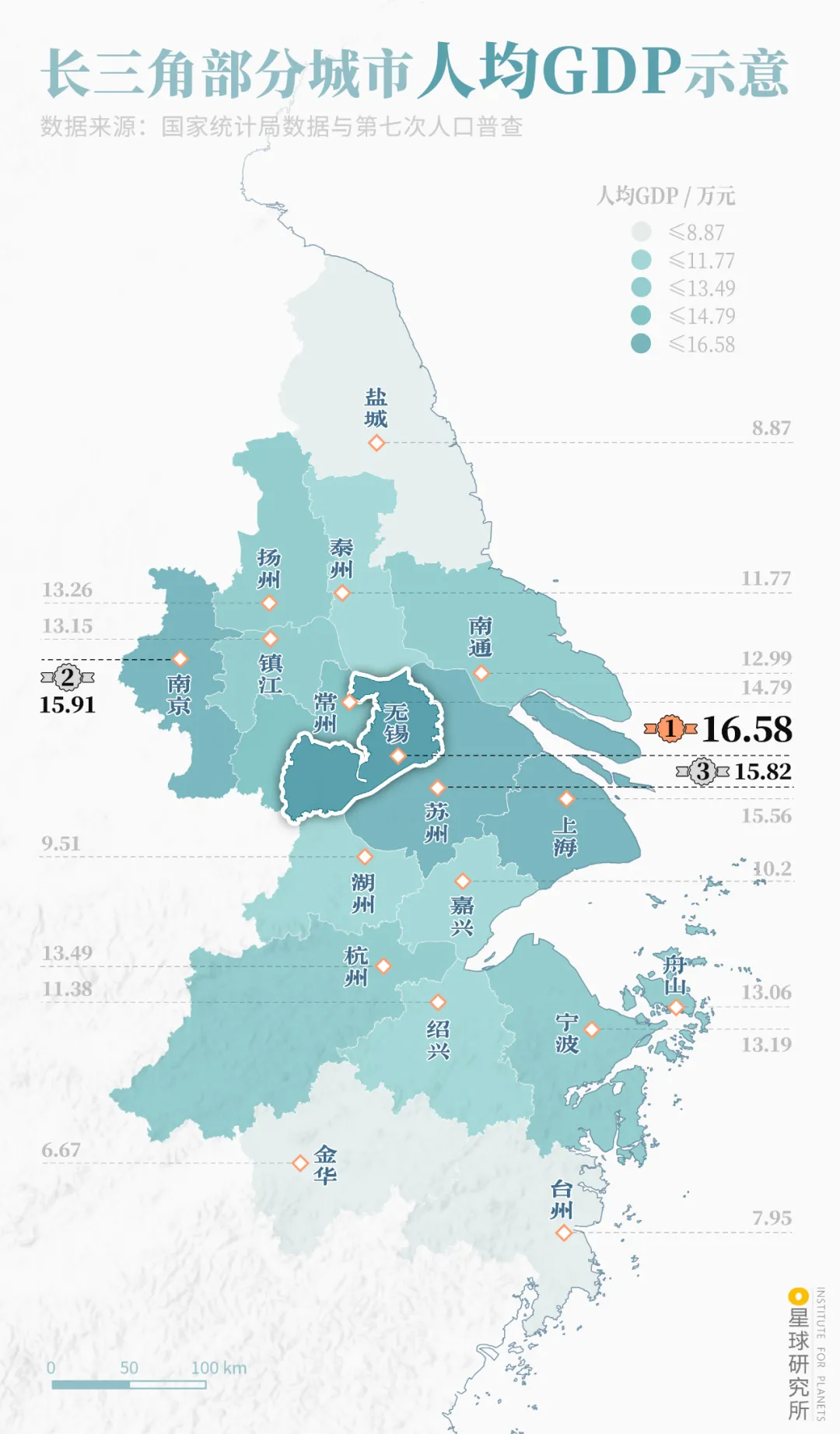 長三角部分城市2020年人均GDP示意 | 製圖@陳志浩&陳隨/星球研究所