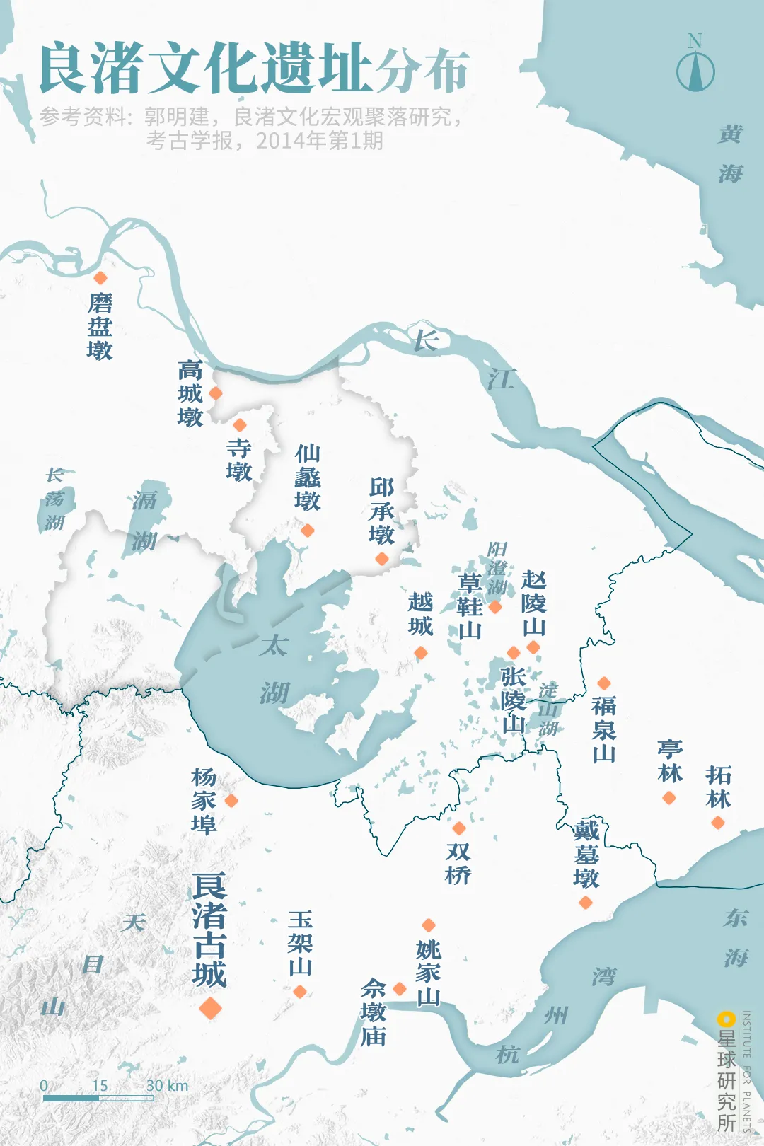 良渚文化主要分佈在太湖流域,其中良渚古城遺址已列入世界遺產名錄;下圖是良渚文化遺址分佈示意 | 製圖@陳志浩&陳隨/星球研究所