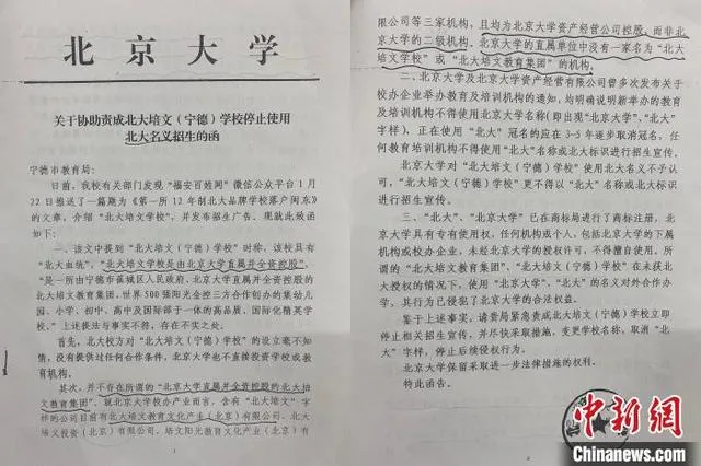 此前,北京大學8月10日再次發函稱,“寧德北大培文學校”的名稱中包含該校校名簡稱,且未經該校授權,應限期予以規範、更名。