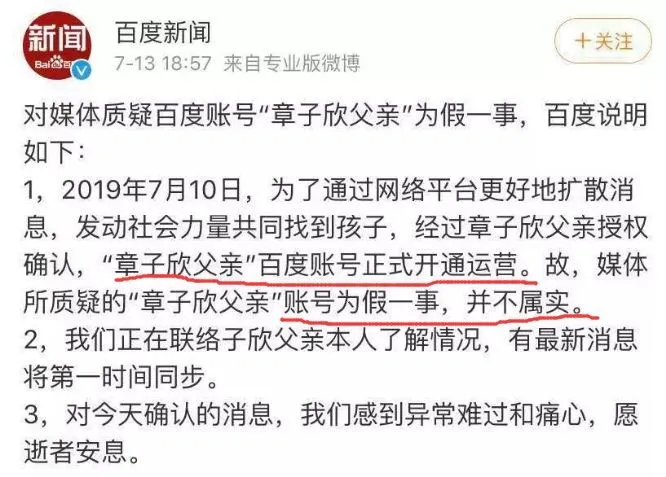 7月13日18:57,@百度新聞 對媒體質疑“章子欣父親”百度賬號為假一事做出回應。