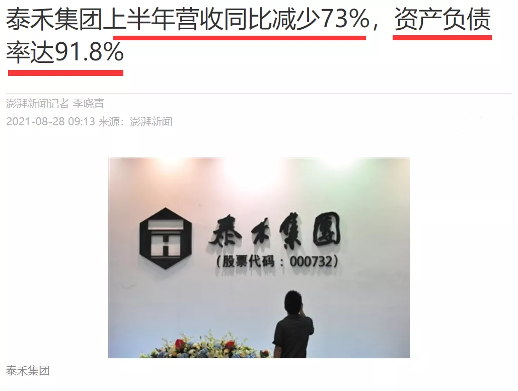 另外,有意思的是,業主送錦旗的當天,澎湃新聞推送了另外一則報道:《泰禾集團上半年營收同比減少73%,資產負債率達91.8%》