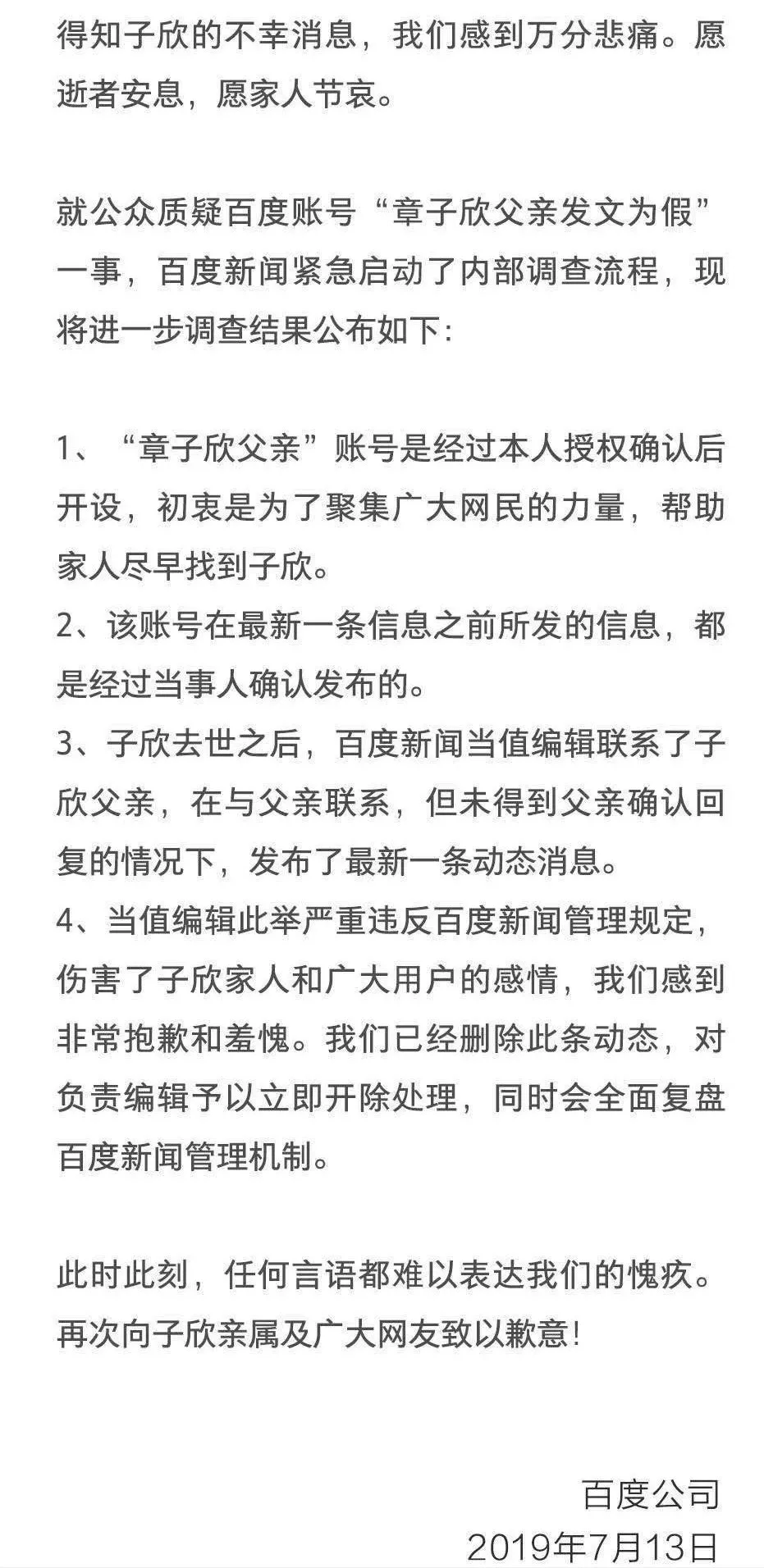 “在子欣去世之後,百度新聞當值編輯聯繫了子欣父親,在與父親聯繫,但未得到父親確認回覆的情況下,發佈了最新一條動態消息。”