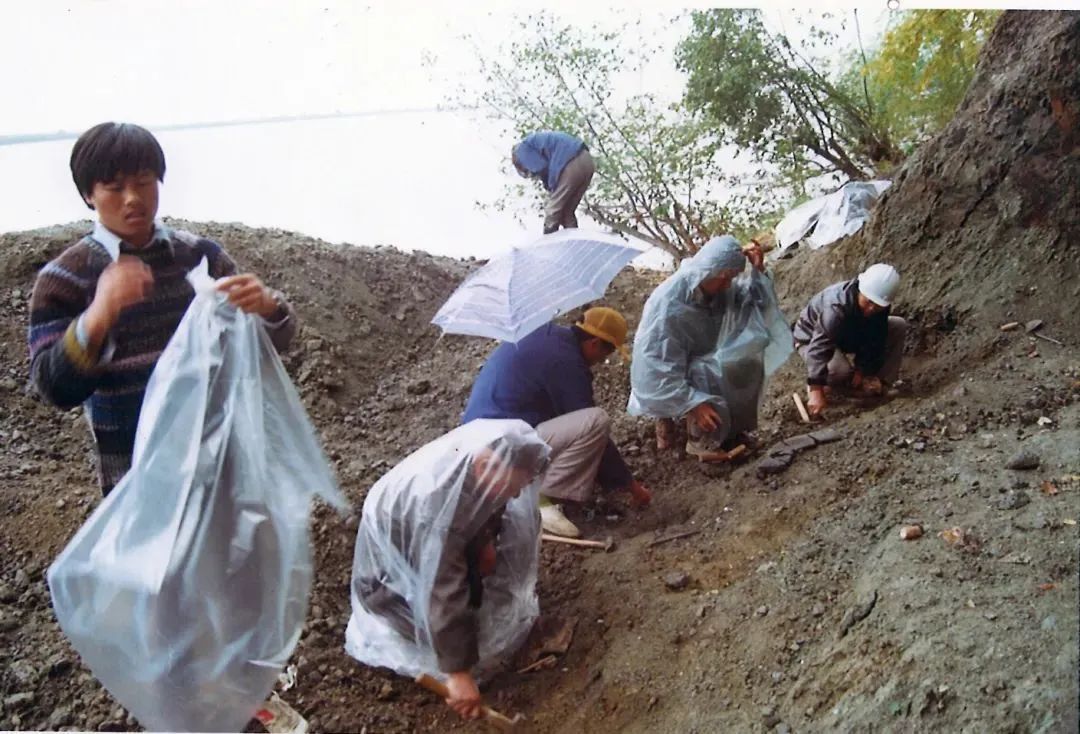 這張照片展示了我們和老先生們一起在江邊挖掘恐龍的場景。天空經常飄着雨,我們就披上塑料布開始工作。老先生們的言傳身教對我影響很大。