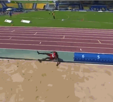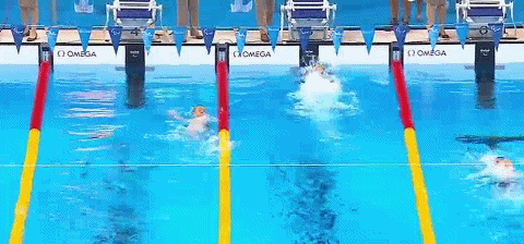 他在出發時只能咬住毛巾,保持姿勢,聽着哨音。在達到時,只能以頭觸壁的方式撞擊終點,撞得很猛。