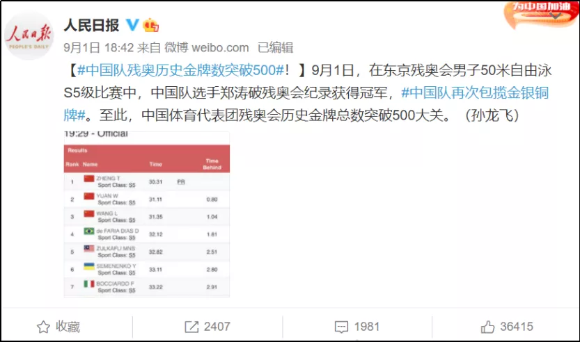 男子50米自由泳S5級比賽中,中國隊選手鄭濤破殘奧會紀錄,獲得冠軍,至此,中國隊在殘奧會歷史上金牌總數突破了500大關。