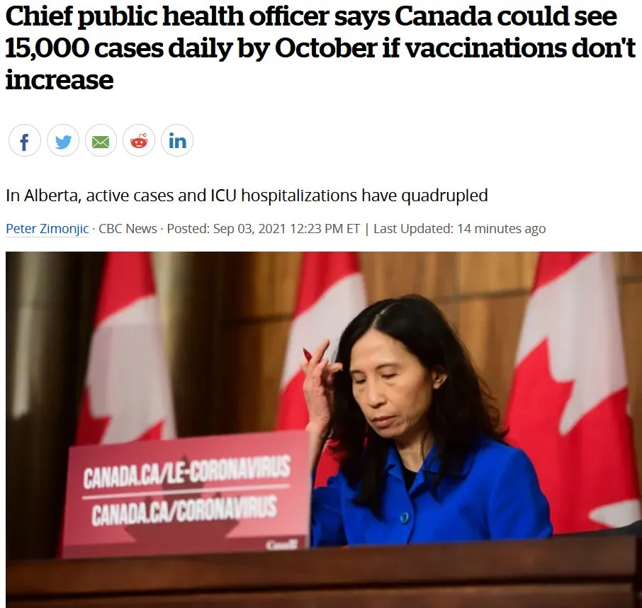 今天,加拿大首席衞生官譚詠詩剛剛公佈了最新的疫情數據模型,如果疫苗接種率不能迅速增加,新的限制措施也沒有出台的話,到9月底10月初,每天的新增病例將多達15000例。