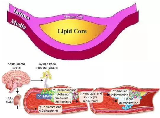 具體來説,急性精神壓力會導致去甲腎上腺素釋放,從而作用於內皮細胞和巨噬細胞等,導致內皮粘附分子的表達和趨化因子的釋放增加,單核細胞等白細胞遷移到各組織,包括存在粥樣硬化斑塊的主動脈中,進一步促進斑塊破裂。