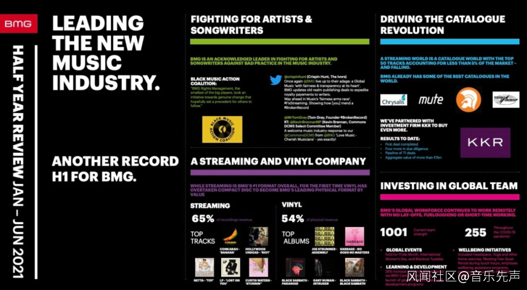 2021年上半年,2.96億歐元的收入中,62.9%來自詞曲版權業務,37.1%來自錄製音樂業務;運營EBITDA達5000萬歐元(約6000萬美元),按固定匯率計算,比2020年同期的4900萬歐元增長了7%。