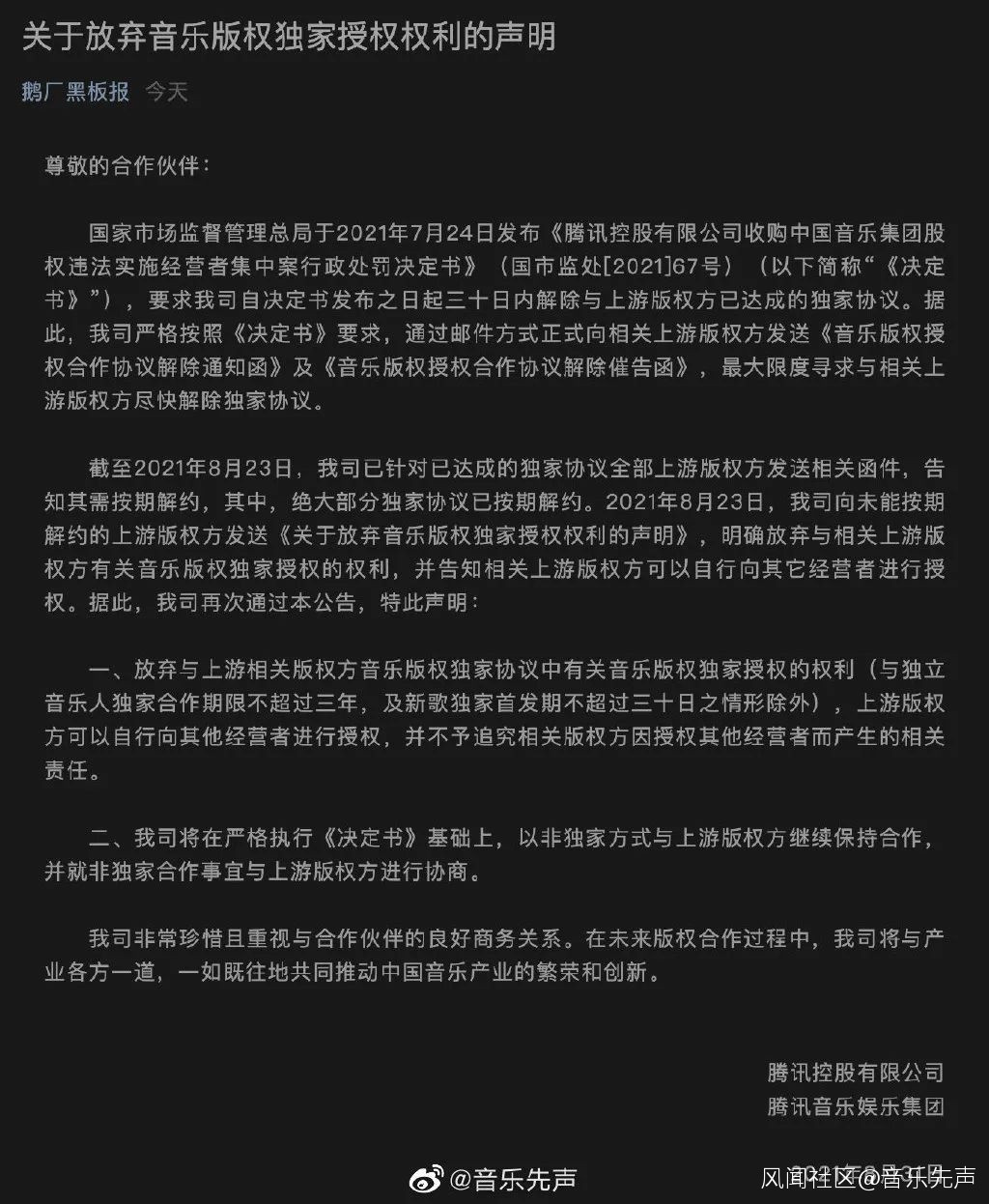 騰訊在聲明中稱,放棄與上游相關版權方音樂版權獨家協議中有關音樂版權獨家授權的權利(與獨立音樂人獨家合作期限不超過三年,及新歌獨家首發期不超過三十日之情形除外),上游版權方可以自行向其他經營者進行授權,並不予追究相關版權方因授權其他經營者而產生的相關責任。同時,將在嚴格執行《決定書》基礎上,以非獨家方式與上游版權方繼續保持合作,並就非獨家合作事宜與上游版權方進行協商。