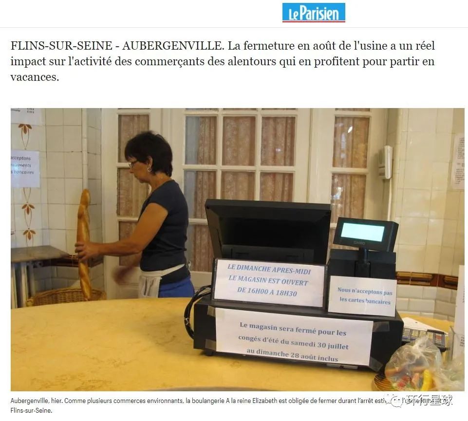 因為雷諾工廠放暑假,連帶旁邊的麪包店都歇業一個月。收銀機上的通知説:7月30號到8月28號之間關門