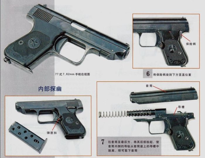 77式手槍結構緊湊、小巧,採用自由槍機式自動原理、慣性閉鎖,擊發機構為擊針平移式,整槍的構造十分簡單,分解之後也沒有過多的零部件。