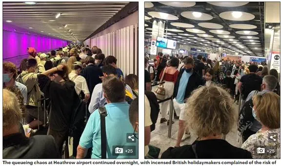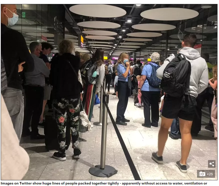 昨天晚上,一大批外出度假的英國人紛紛湧進機場走廊,**有人戴口罩、有人不戴,沒有絲毫社交距離,**擠在隊伍裏45分鐘,才移動1.5米左右的距離,烏壓壓的人羣,場面令人汗顏。
