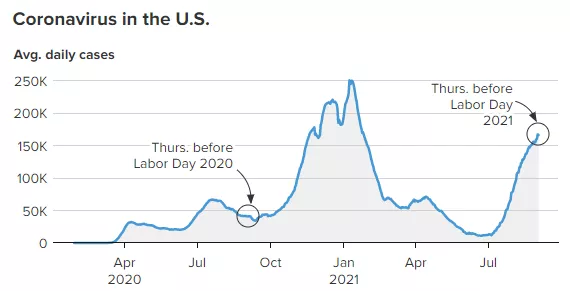 2021年勞動節前夕,美國平均日新增感染病例比1年前高出10萬例以上。