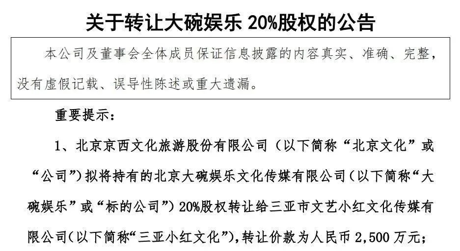 △北京文化出售持有的賈玲公司大碗娛樂股份(注:來自北京文化公告)