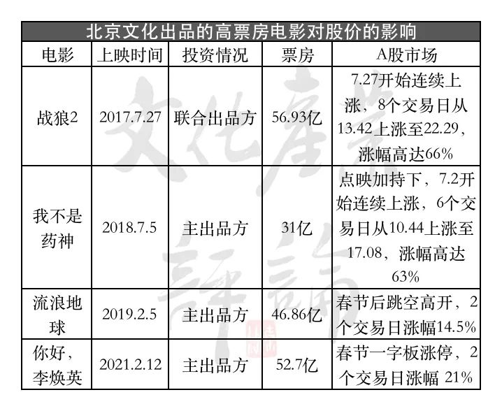 至此,北京文化“爆款製造機”的名號徹底打響,而隨着高調保底的還有票房與股價的共振。
