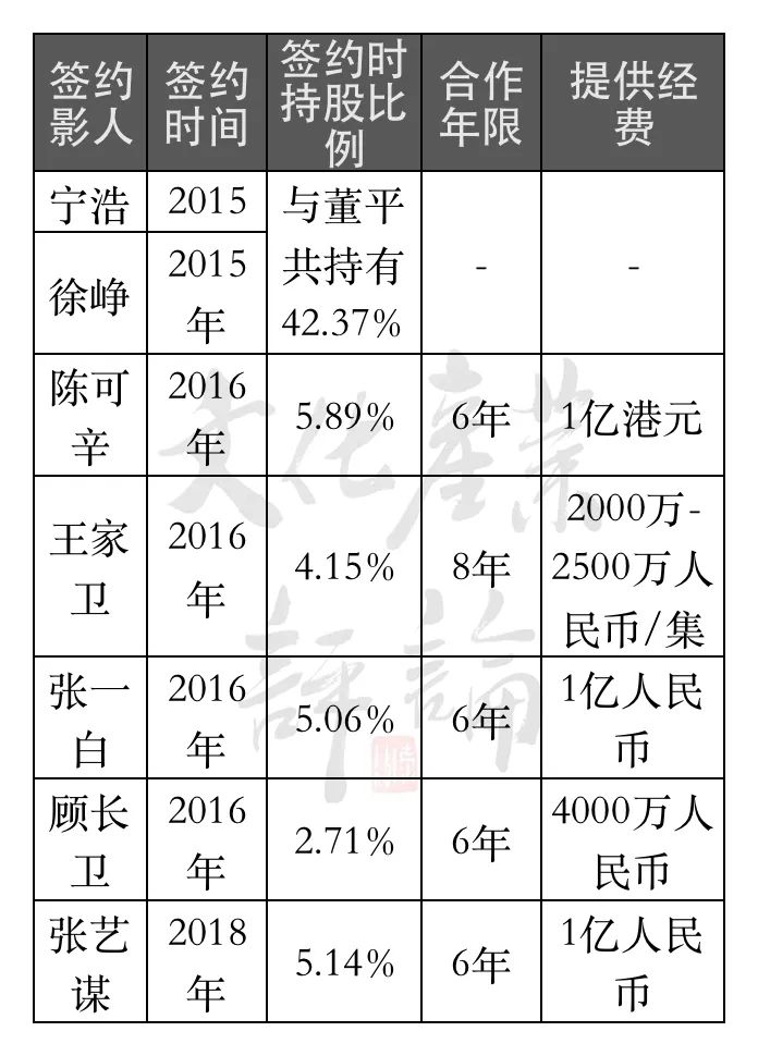 2014年,也是華誼成立20週年之際,創始人王忠軍提出**“去電影化”戰略,轉向IP授權、開發實景娛樂**。同時,大舉進行產業投資。華誼斥資20多億元收購了馮小剛的東陽美拉、楊穎等6位明星創立的東陽浩瀚和張國立的浙江常升,是當年明星證券化的重要推手。