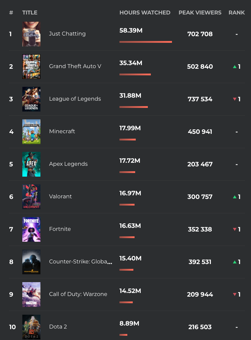 我們還是以數據説話,根據Escharts統計,在Twitch近七天直播熱度榜單中,《VALORANT》位列第六位,在線峯值高達20萬。在FPS同類型產品中,僅次於《APEX》,位列第二。