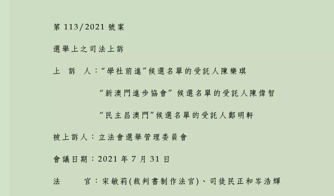 之後,“民主昌澳門”“學社前進”“新澳門進步協會”決定向終審法院上訴。7月底,澳門終審法院裁定上訴理由不成立。