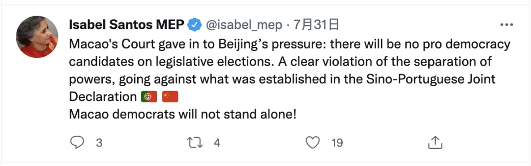 雖然澳門曾被葡萄牙管治,但除了桑托斯,似乎並沒有其他葡萄牙人及官方機構發出類似的聲音。而桑托斯這條推文底下轉發、點贊、評論數加在一起,還沒有過30個。