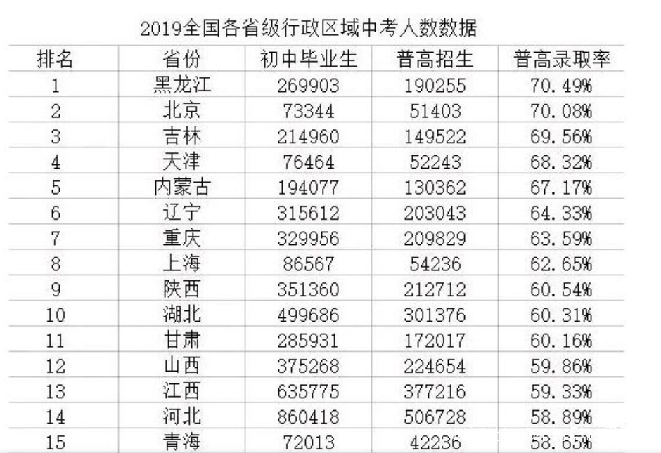 根據網上的一些資料,這是2019年全國各省市區的中考錄取率