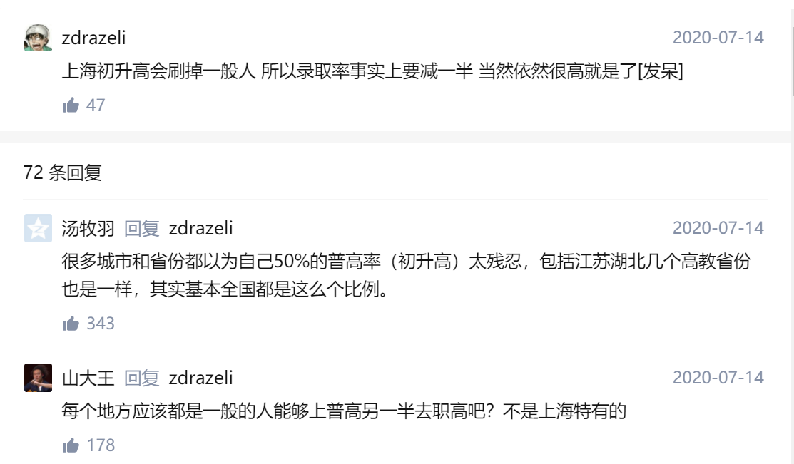 在這個文章下面,就有一個評論,説“上海初升高會刷掉一般人 所以錄取率事實上要減一半”
