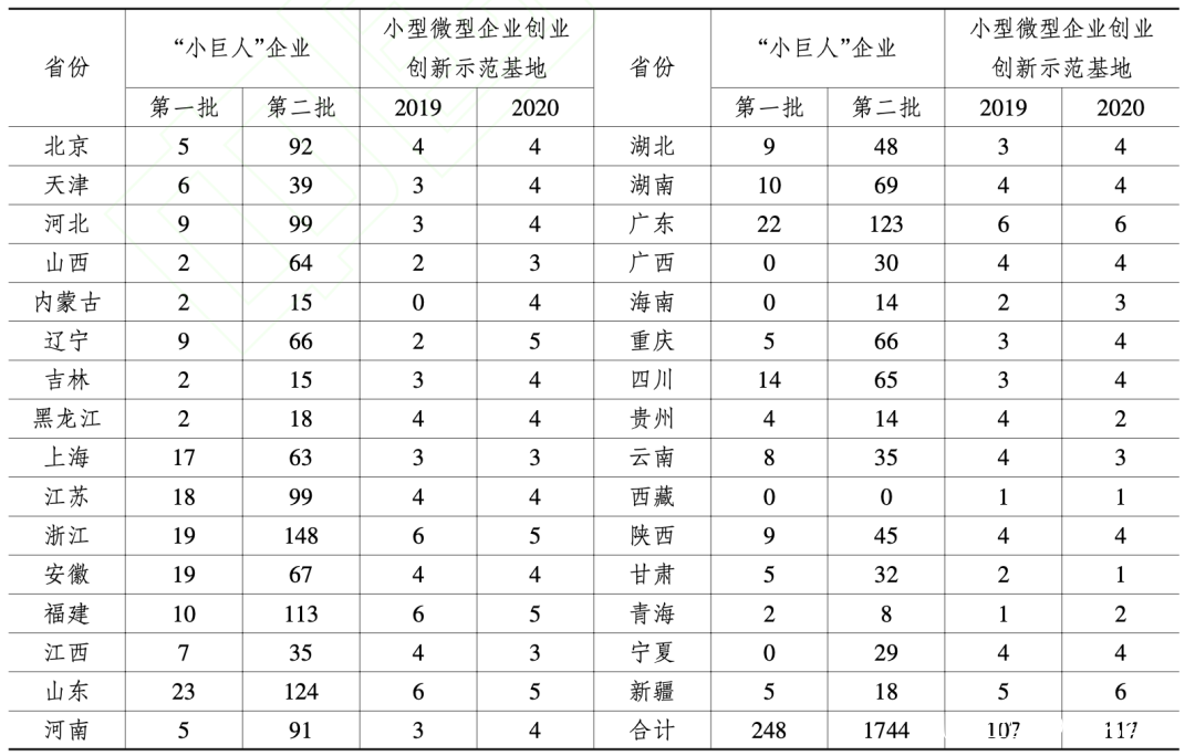 為配合“小巨人”企業的培育,國家還出台了《國家小型微型企業創業創新示範基地建設管理辦法》,提出建設一批小型微型企業創業創新示範基地,旨在匯聚各類優質服務資源,支持小微企業創新創業。這些基地主要由擁有資質的法人單位建設和運營,基礎設施先進、運營模式科學、服務功能齊全、創新鏈完整、社會信譽度高、帶動影響力強。2019年6月,工業和信息化部公佈了第一批“小巨人”企業名單;2020年11月又公佈了第二批“小巨人”企業名單。2019年10月,工業和信息化部公佈了《2019年度國家小型微型企業創業創新示範基地名單》;2020年8月,又公佈了《2020年度國家小型微型企業創業創新示範基地名單》。這些公佈的”小巨人”企業和”小微企業創業創新示範基地”分佈在不同的省(區、市),具體情況如表1所示。