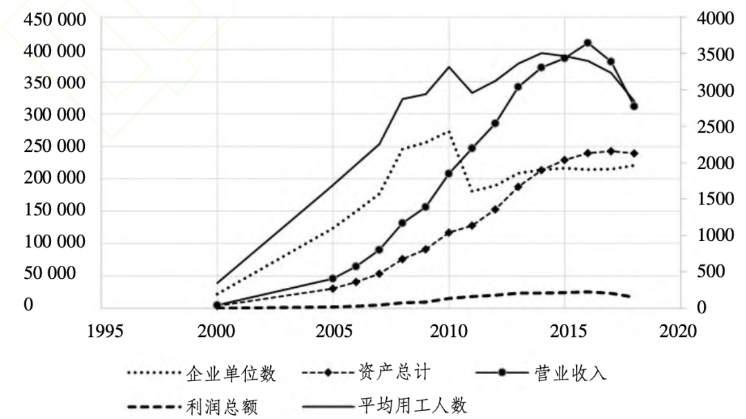 由圖1可知,我國民營企業規模在21世紀的前10年一直呈直線式上升,2010年以後有短暫的下跌,2015年以後企業數再度減少。民營企業的營業收入有較大幅度的增長,到2016年達到頂峯,隨後開始下滑,至今沒有明顯的大幅度回升。民營企業的資產總額總體呈上升趨勢,2000要2018年的年均增長率達到25.74%,近年的增長率有所下降;平均用工人數和利潤總額大體呈增長之勢,沒有太大的波動。
