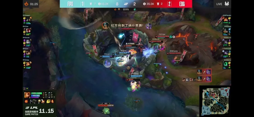 優勢巨大的FPX陷入了五打六的局面,最終沒能抵抗這股接湧而至的神力,痛失好局,被edg拿下賽點局。