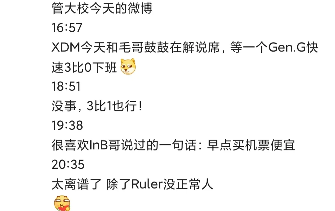 季後賽的大校延續了常規賽的統治力,隨着一波密集的操作——“SN3:2LNG”“LNG到此為止”“更看好TES”“RA打野小優”“我覺得BLG能贏”,管澤元成功殺出了自己的身價,各路家屬紛紛在直播間上供,WE名宿微笑甚至親自打電話求法(主要是求管澤元別看好WE),一時間正如直播間觀眾所説,管大校的直播間的香火比靜安寺的還旺。
