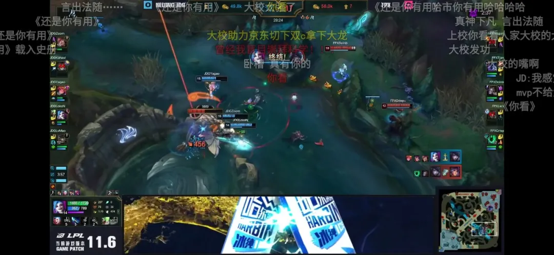 FPX取得明顯優勢,上單位置的船長和ADC位置的厄斐琉斯已經處理不來了,就當所有人都以為FPX穩操勝券的時候,管大校大膽推測