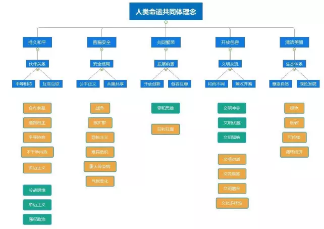 圖中顯示出來人類命運共同體理念分五大方面:持久和平、普遍安全、共同繁榮、開放包容、清潔美麗。大家可以看不同的方面都有對應,我們應該堅持的和應該反對的,看了圖會有所思考和啓迪的。