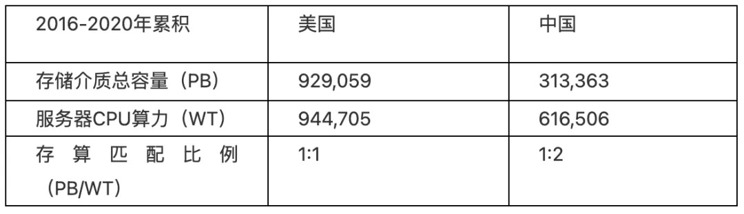 2020年統計報告顯示,發達國家美國在存儲、計算的匹配比例(算力:容量)為1:1,相比而言,中國在存儲、計算的比例僅為1:2,比例嚴重地失衡,説明我們的數據資源還不夠豐富。