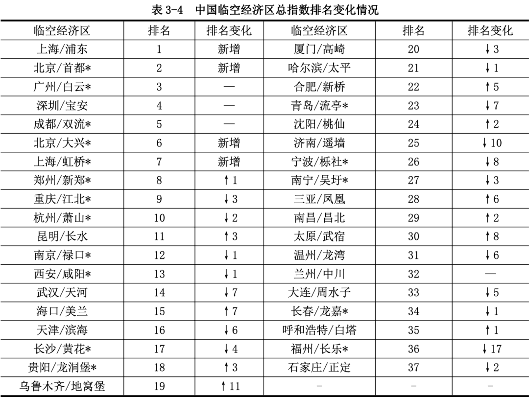 從縱向變化來看,與《中國臨空經濟發展指數報告(2020)》相比,除北京、上海四個臨空經濟區外,有 11 個臨空經濟區排名上升,18 個臨空經濟區排名下降。
