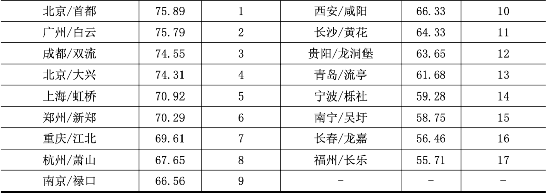 綜合排名來看,上海浦東臨空經濟區、北京首都機場臨空經濟示範區、廣州臨空經濟示範區為前三甲, 深圳臨空經濟區、成都臨空經濟示範區、北京大興國際機場臨空經濟區、上海虹橋臨空經濟示範區、鄭州航空港經濟綜合實驗區緊隨其後。長期來看,這幾個城市的臨空經濟區會形成較為激烈的競爭。