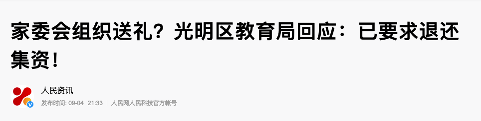 根據澎湃新聞報道,日前,有網友通過人民網領導留言板向深圳市光明區領導反映,公明中學初二年級家委會發動所有班級為教師節購買禮品。