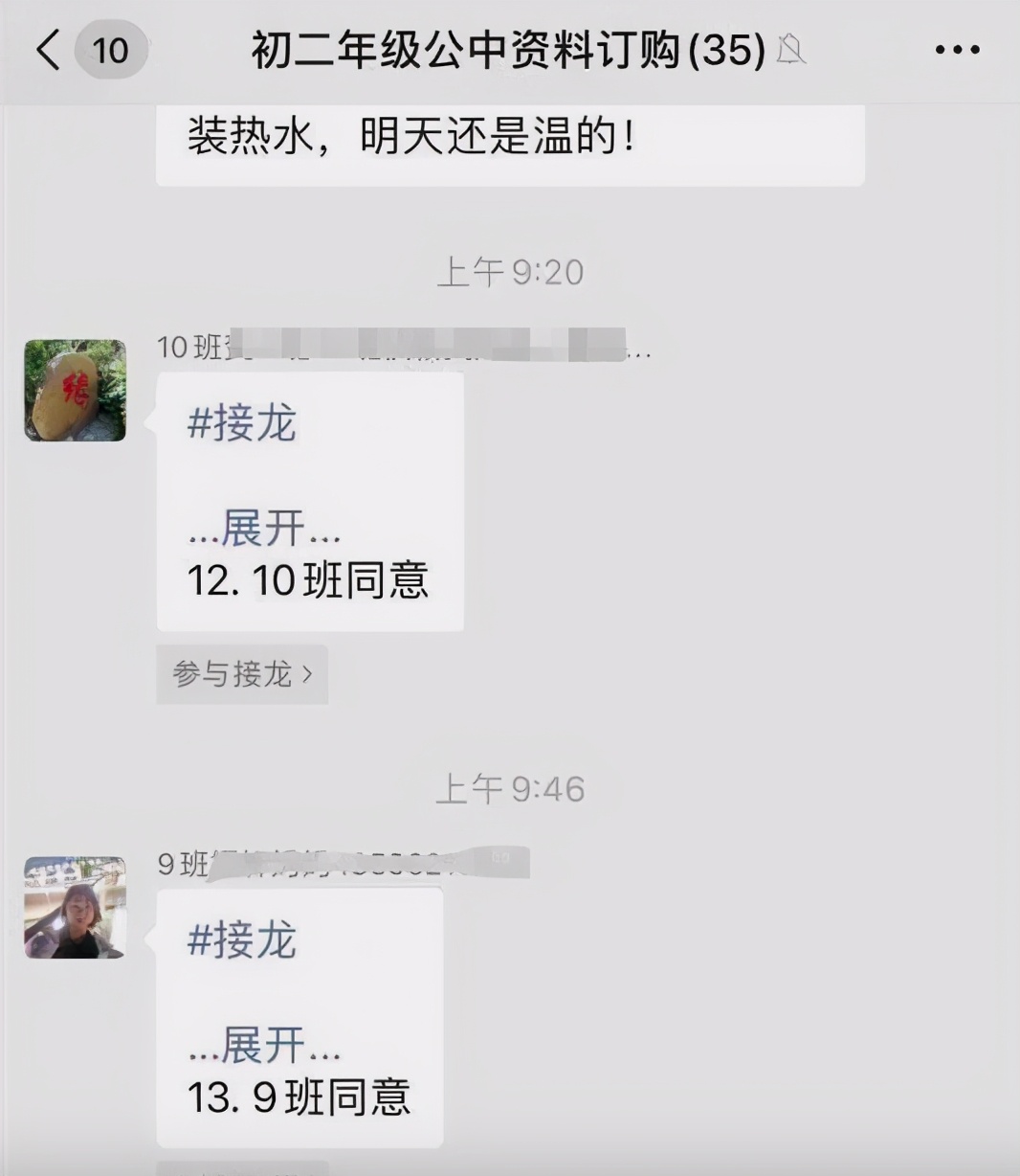 網友附上截圖顯示,“初二年級公中資料訂購”微信羣中,有頭銜為“2班家委會長”羣成員發言催促: