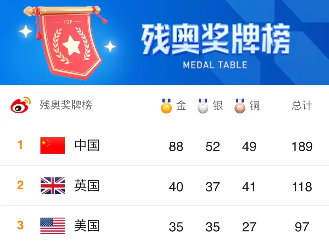 自04年雅典殘奧後,中國隊屆屆位居獎牌榜首。照今年的領跑趨勢,毫無懸念將再次蟬聯。