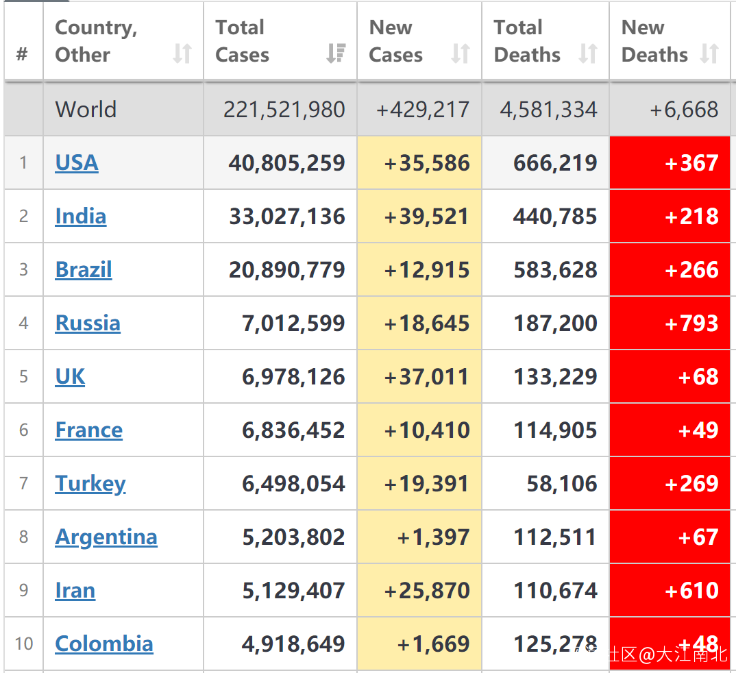 9月5日,全球新增新冠確診429,217例;累計確診2.2152億例;新增病亡6,668例;累計病亡458.13萬例。