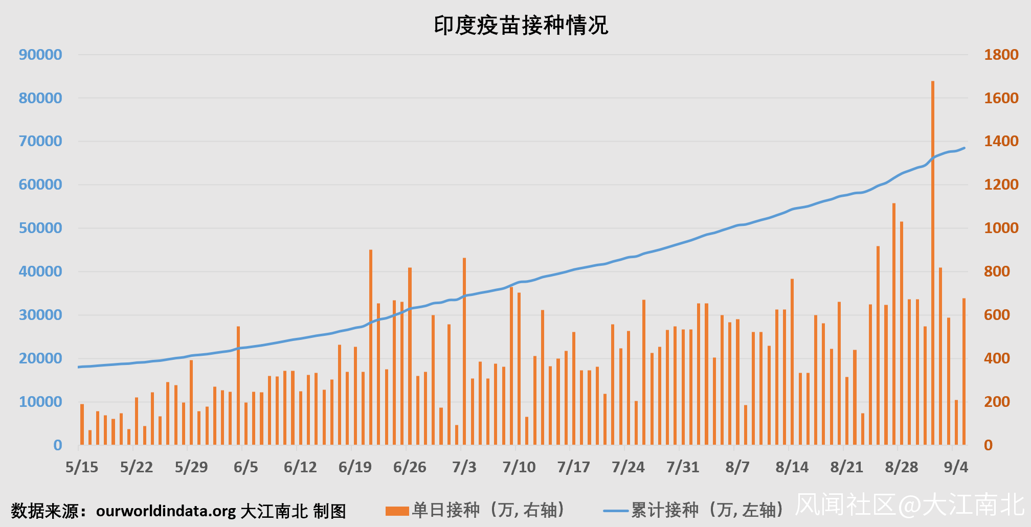 截止2021年9月5日,印度累計接種6.8452****億劑,列第二位,**其中單日新增接種678萬劑。**印度至少接種一劑的人羣佔比為37.4%,完成接種的人羣佔比為11.4%。印度每百人累計接種49.13劑,是中國的32.9%。