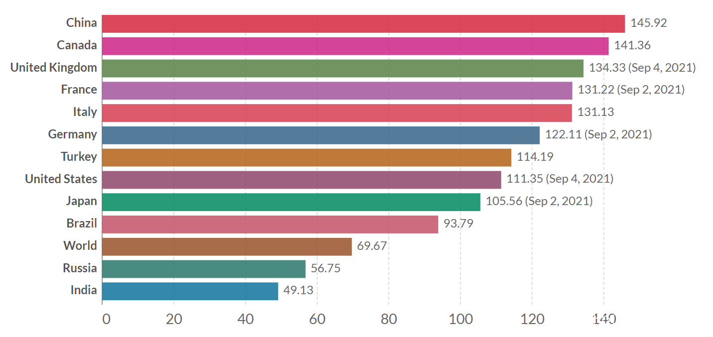 土耳其排名第七:114.19劑,環比增加0.42劑;