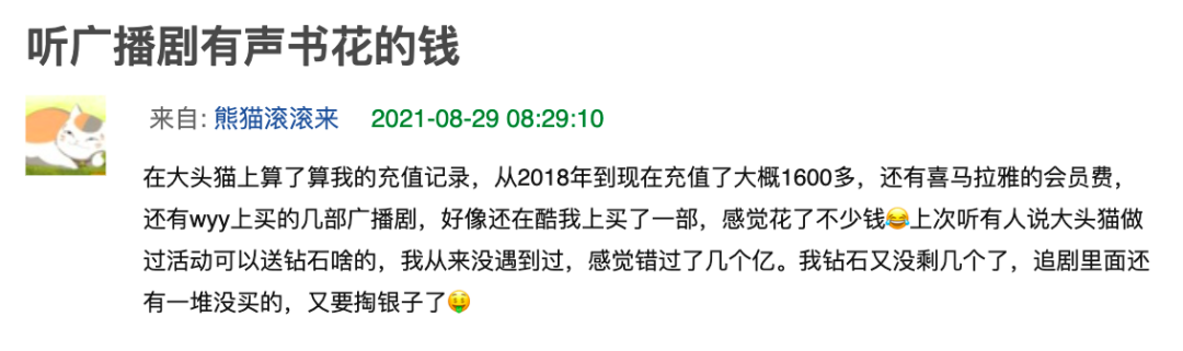 當然,也有聽眾認為“付費是對主創勞動付出的一種認可”。皓星告訴數娛君,自己近三年來為廣播劇消費近2000元,“廣播劇每季包含正片+花絮+小劇場,總長度在十幾小時左右,也就是一張電影票錢,只要內容不是特別差,休閒、通勤時聽一兩集,還是可以值回票價的。”