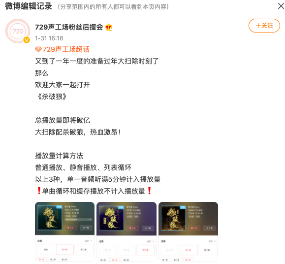在此基礎上,前台播放數據的可信度也需要留意。今年年初,729聲工場粉絲後援會在為廣播劇《殺破狼》打榜期間,無意透露貓耳FM後台播放量統計規則。也就是説,一些看似播放數據喜人的廣播劇,多少摻雜了粉絲打開免費試聽劇集“刷量”的努力。