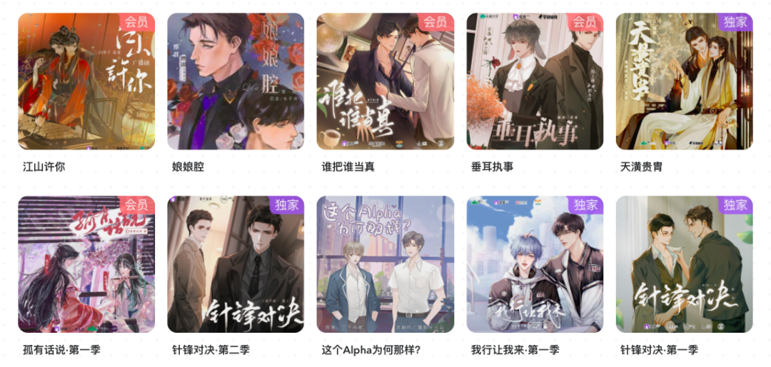 比如去年10月,漫播一上線就接連拿出了知名耽美小説《針鋒對決》《含桃》等多部廣播劇,很快在圈內積攢了人氣。很快成長為與貓耳FM齊名的平台,儘管兩者上線相隔多達10年。