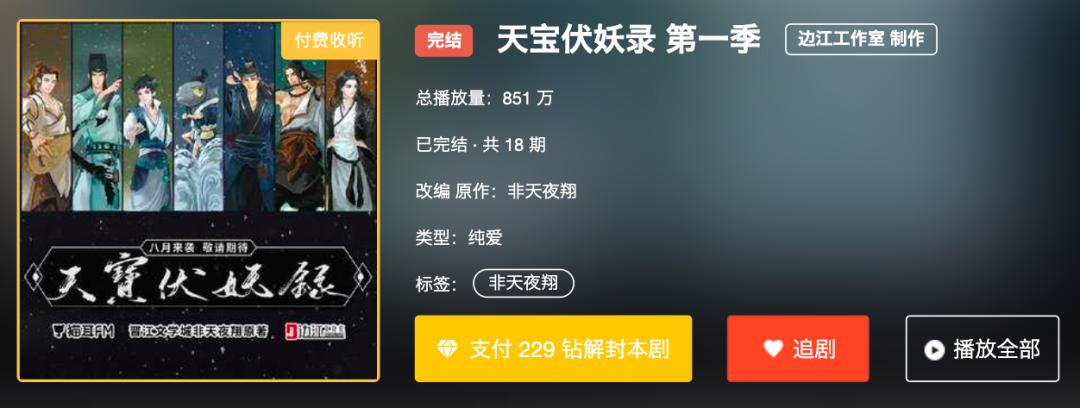 截止今年9月4日,《天寶伏妖錄》第一季總播放量為851萬,後三季均低於這個數。雖然這類玄幻題材的劇後期費用會明顯高於普通的校園甜寵劇,但不難推測:一部廣播劇想要回本,單季播放量破千萬可能才算穩****妥。