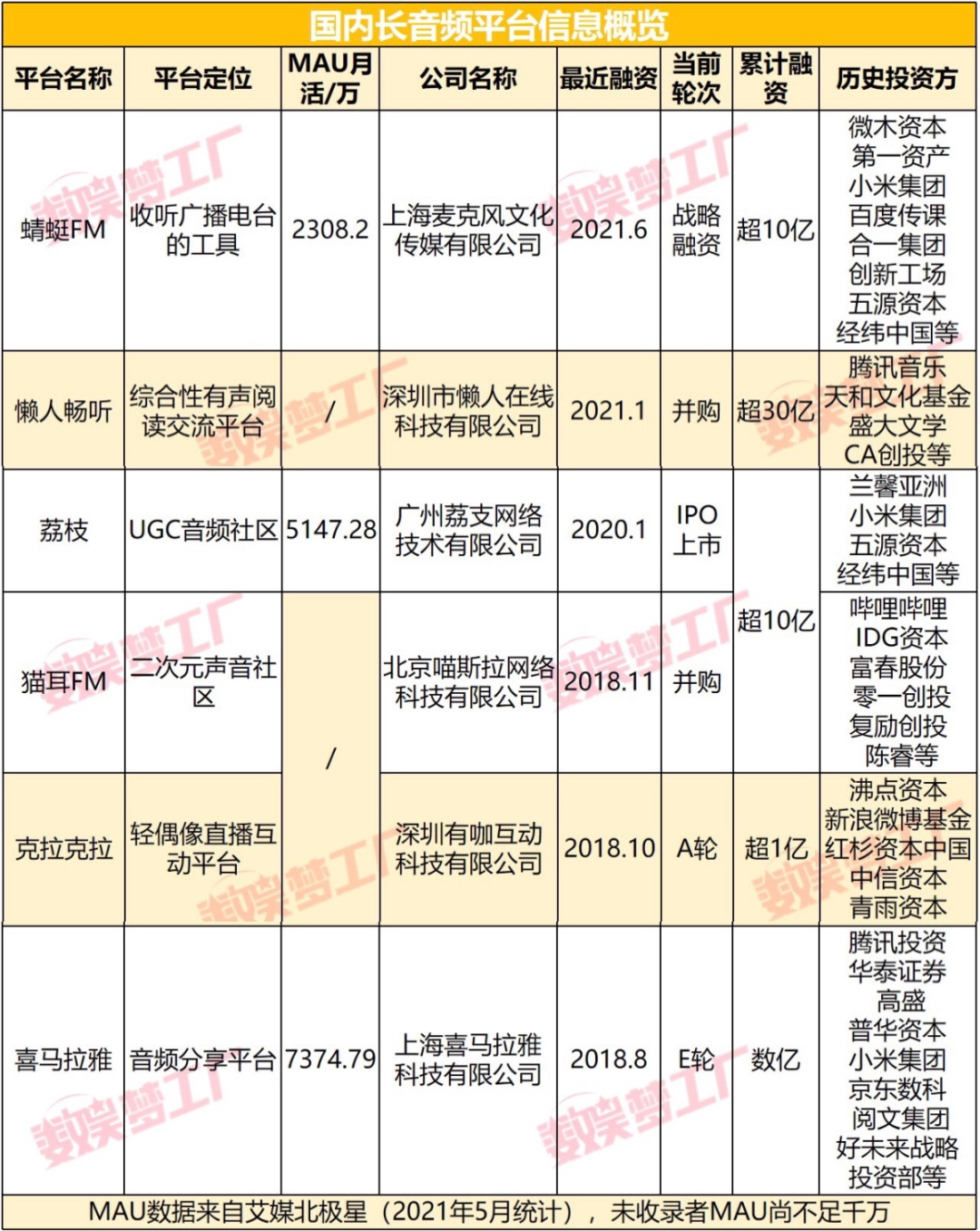 數娛君梳理在線音頻平台融資歷史發現,無論是月活不足千萬、以直播互動和廣播劇為主的克拉克拉,還是定位二次元聲音社區的貓耳FM,最近幾年都備受資本青睞,單次融資都在億元以上。