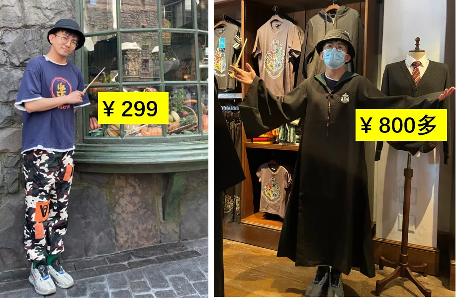 買買買方面,像哈利波特的魔杖有兩款,有景區魔法互動功能的是349,普通收藏款是299,巫師袍是800多一件。還有99塊的金色飛賊紀念徽章,139塊恐龍髮箍…