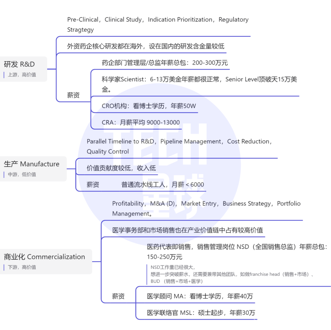 對於尚不清晰自己出校後適合去企業哪些部門和環節、職業上升通道的學術界候選人,Carry會建議先好好了解商業界全盤。比如,結合藥品從研發到商業化的價值鏈,就能看出人才的薪資水平所對應的不同環節的價值。