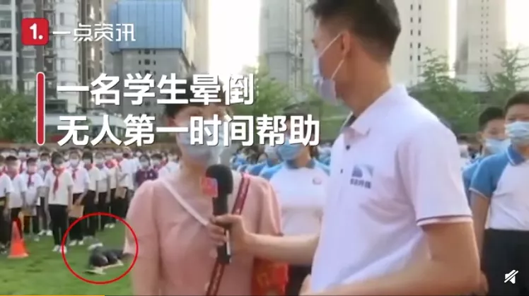 某中學學校老師在開學典禮上直播接受採訪,鏡頭面前,該老師正在侃侃而談“學校硬件軟件都在升級”時,突然一名學生暈倒了,在長達30秒的時間裏,無人幫扶。