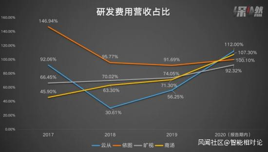 事實上,鉅額研發費用的投入,一直都是AI行業內的共同趨勢。雖然商湯科技的研發總費用是其它“三小龍”所不能比的,但如果對比幾家公司的研發費用佔比,我們不難發現商湯科技的研發費用率一直是以一個穩定的態勢在增長,並不會忽高忽低,目前來看,也屬於行業內的平均值。